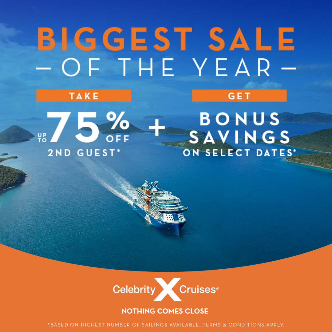 Cruise must be booked Dec. 17, 2025 through Apr. 6, 2026 (the “Offer Period”) and applies to select sailings 3-nights and longer departing Dec. 09, 2025 – May 10, 2028 as well as 9-Night and longer Alaska Cruisetours on Celebrity Summit departing May 08, 2026 – Sept. 4, 2026 and Celebrity Solstice departing May 07, 2027 – Sept. 03, 2027. (the “Offer Cruise”). Promo code not required. Full deposit must be paid by deposit payment required due date. Standard full deposit penalty is applied if booking is cancelled within final payment period; see CEL’s cancellation policy for details. Non-Refundable Deposit Bookings (“NRDB”): To qualify for the lowest available cruise fare, guest must choose a nonrefundable deposit. All deposit payments for NRDB made after 02/03/23 are nonrefundable from the time of booking. NRDB are applicable to groups at prevailing rates. Not applicable to incentive, contract, or charter groups. Nonrefundable deposit offers are applicable to sailings within final payment, however full deposit is due at time of booking. BOGO 50% Off 2nd Guest Offer is for Refundable Fares only, applies to new, individual bookings at standard rates during the Offer Period, and provides 50% off refundable cruise fares on the 2nd guest only in the same stateroom as the first full fare guest on an Offer Cruise, excluding 2025 and 2026 Galapagos sailings. All other charges, including but not limited to, taxes, fees and port expenses, when not included in the displayed price, are additional and apply to all guests. BOGO 75% Off 2nd Guest Offer is for Non-Refundable Fares only, applies to new, individual bookings at standard rates during the Offer Period, and provides 75% off nonrefundable cruise fares on the 2nd guest only in the same stateroom as the first full fare guest on an Offer Cruise, excluding all Galapagos sailings. All other charges, including but not limited to, taxes, fees and port expenses, when not included in the displayed price, are additional and apply to all guests. Combinability: BOGO 50% Off 2nd Guest for Refundable Fares, BOGO 75% Off 2nd Guest for NonRefundable Fares and 3rd/4th/5th Guest Cruise Fare Offers will be automatically applied at checkout and are combinable with Savings and OBC Offers and All Included or No Perk Rate. BOGO 50% Off 2nd Guest for Refundable Fares, BOGO 75% Off 2nd Guest for Non-Refundable Fares and 3rd/4th/5th Guest Cruise Fare Offers do not apply to Group X Rates, single occupancy guests, charters or contracted groups and are not combinable with Travel Agent, Interline, or Net Rates, Senior Rates, Exciting Deals, or worker cabins. BONUS SAVINGS/OBC OFFERS Up to $900 Savings Offer applies to new, individual bookings at standard and prevailing or closed group standard or GroupX rates from 19/12/25 to 24/12/25, 30/01/26 to 04/02/26 on an Offer Cruise, excluding Celebrity River Cruises and Galapagos, and provides cruise fare savings per stateroom varying by stateroom category and length of voyage booked: 3 to 5 nights, savings of $100 AUD for inside and ocean view, $250 AUD for verandas, Concierge Class, AquaClass® and $500 AUD for Suites; 6 nights or longer, savings of $150 AUD for inside and ocean view, $400 AUD for verandas, Concierge Class, AquaClass® and $900 AUD for Suites. Up to $1000 Savings Offer applies to new, individual bookings at standard and prevailing or closed group standard or GroupX rates from 26/12/25 to 29/12/25, 01/01/26 to 07/01/26, 09/01/26 to 14/01/26, 16/01/26 to 21/01/26, 23/01/26 to 28/01/26 on an Offer Cruise, excluding Celebrity River Cruises and Galapagos, and provides cruise fare savings per stateroom varying by stateroom category and length of voyage booked: 3 to 5 nights, savings of $150 AUD for inside and ocean view, $300 AUD for verandas, Concierge Class, AquaClass® and $600 AUD for Suites; 6 nights or longer, savings of $250 AUD for inside and ocean view, $500 AUD for verandas, Concierge Class, AquaClass® and $1000 AUD for Suites. Up to $600 Onboard Credit (OBC) Offer applies to new, individual bookings at standard and prevailing or closed group standard or GroupX rates from 18/12/25 , 25/12/25, 30/12/25 to 31/12/25, 08/01/26,15/01/26, 22/01/26, 29/01/26 on an Offer Cruise, excluding Celebrity River Cruises and Galapagos, and provides onboard credit (OBC) per stateroom varying by stateroom category and length of voyage booked: 3 to 5 nights, OBC of $50 USD for inside and ocean view, $150 USD for verandas, Concierge Class, AquaClass® and $300 USD for Suites; 6 nights or longer, OBC of $100 USD for inside and ocean view, $250 USD for verandas, Concierge Class, AquaClass® and $600 USD for Suites. $150 AUD Savings Offer Weekend Flash Sales applies to new, individual bookings at standard and prevailing or closed group standard or GroupX rates from 2/01 to 5/01, 30/01 to 02/02 on an Offer Cruise, excluding Celebrity River Cruises and Galapagos, and provides cruise fare savings per stateroom on select sailings departing 09/01/26 through 05/10/28. $150 AUDSavings Offer Book Now Bonus applies to new, individual bookings at standard and prevailing or closed group standard or GroupX rates from 23/12 to 24/12, 06/01 to 07/01, 13/01 to 14/01, 20/01 to 21/01, 27/01 to 28/01 on an Offer Cruise, excluding Celebrity River Cruises and Galapagos, and provides cruise fare savings per stateroom on select sailings departing 23/12/25 through 05/10/28. Combinability: Savings and OBC Offers are combinable with BOGO 50% Off 2nd Guest for Refundable Fares, BOGO 75% Off 2nd Guest for Non-Refundable Fares Offers and 3rd/4th/5th Guest Cruise Fare Offers, All Included or No Perk Rate. Offers will be automatically applied at checkout. Individual reservations can be transferred into an existing group, certain restrictions apply. Single occupancy guests paying 200% cruise fare are eligible. All offers are capacity controlled; availability varies by sailing, and eligible staterooms may sell out. All offers are non-transfera