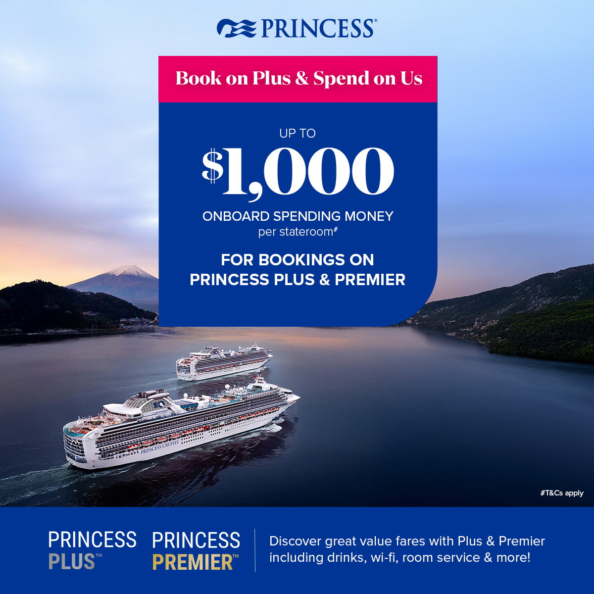 > up to $1,000 per stateroom in onboard spending money# on select voyages when you choose a Princess Plus or Princess Premier fare