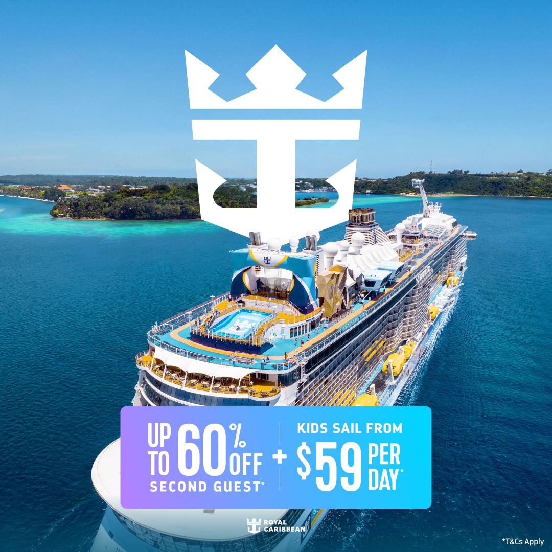 BOGO60 on Local & International Sailings savings applies to new bookings made between 12:01am (AEDT) Sunday, 1st March 2026 – 11:59pm (AEDT) Tuesday, 31st March 2026. Offer applies to local & international sailings* departing from 2nd March 2026 onwards. BOGO60 provides up to 60% savings off the price of cruise fare of the second guest booked in the same stateroom as first, full fare paying guest. BOGO60 savings applied to cruise fare at checkout. Kids Sail from $59 Per Day on Local Sailings applies to new individual and named group bookings at prevailing rates made between 12:01am (AEDT) Sunday, 1st March 2026 – 11:59pm (AEDT) Tuesday, 31st March 2026. Offer applies to local sailings 2 nights or longer departing between 2 nd March 2026 and 5th April 2027 (“Sailing Window”). Offer provides reduced cruise fare from AUD$59 / NZD$69 per person per day for additional guests that are 0-12 years old as of the departure date booked when traveling in the same stateroom as the first full paying and second guests. Summer NRD offer is valid for new, individual double occupancy bookings on select Anthem of the Seas and Voyager of the Seas local sailings during the 2025/2026 Australia season and does not combine with any other offers. Offers are valid between 12:01am (AEDT) Monday, 2nd March 2026 – 11:59pm (AEDT) Tuesday, 31st March 2026 unless sold out prior. Offer is not applicable to triple or quad share bookings. Single occupancy bookings are eligible for ‘Summer NRD’ pricing at 200% of the twin share per person rate. Offer name ‘SUMMER NRD’ must be displayed in the booking in order to qualify for the offer. Applicable to non-refundable deposit bookings only in guarantee (GTY) category ZI (Interior), YO (Oceanview) and XB (Balcony). The exact stateroom grade, cabin number and location of the stateroom on the ship will be allocated at the discretion of Royal Caribbean International. No stateroom requests permitted. Guests booked in GTY staterooms may not be berthed with other travelling parties due to availability. Staterooms allocated may be subject to obstructed views. The Wiggles Themed Sailings: Selected sailings onboard two Royal Caribbean ships during the Australia and New Zealand 2025-26 and 2026-27 season will be themed as ‘The Wiggles’ cruises, and booked guests may choose from a selection of complimentary ‘The Wiggles’ themed onboard events (including Dance Class with Dorothy, Story Time with Wags, Live show and Wiggly Disco Party). Limited additional packages such as the ‘Exclusive Character Breakfast with The Wiggly Friends’ will also be available to purchase. ‘The Wiggles’ themed cruises will be the Voyager of the Seas departing on 28 March 2026, Anthem of the Seas departing on 13 March 2026 and 1 March 2027 and Quantum of the Seas departing on 30 November 2026 and 19 March 2027. Final details of the complimentary entertainment options and additional events for purchase for 2026-27 sailings will be available from June 2026. Select ‘The Wiggles’ performers will sail on the following 2026-27 Wiggly-themed sailings: Tsehay Hawkins (Yellow Wiggle) and The Tree of Wisdom with sail alongside The Wiggly Friends on Quantum of the Seas’ 30 November 2026 4-night Airlie Beach cruise. Lucia Field (Blue Wiggle) and Paul Paddick as Captain Feathersword will sail alongside The Wiggly Friends on Anthem of the Seas’ 1 March 2027 4-night Hobart cruise. Caterina Mete (Red Wiggle) and Evie Ferris (Yellow Wiggle) will sail alongside The Wiggly Friends, including Buddy on Quantum of the Seas’ 19 March 2027 7-night South Pacific cruise. ‘The Wiggles’ individual performers may be substituted and are subject to change without prior notice. Event content may vary from that described. To select or purchase any ‘The Wiggles’ event, the promotional code “WIGGLES” must be selected at the time of booking. Only one promotional code per booking is allowed. All minors under the age of 18 attending a ‘The Wiggles’ event must be accompanied by a parent or legal guardian. ‘The Wiggles’ events, themes and entertainment are available on selected departure dates only, and not included in Royal Caribbean onboard entertainment. Bookings and codes are non-transferrable and may not be exchanged. Events may be altered or cancelled in the event of unforeseen circumstances, or at the discretion of ‘The Wiggles’ management or Royal Caribbean International. Individual performers may be substituted. Please ensure that you have received any required permission to take your child out of school during term time, before booking your cruise. Local regulations may prohibit for taking children on holidays during term time without their school’s permission. Cancellation charges apply to purchased events. Existing bookings of relevant cruises may avail of this promotion. All ‘The Wiggles’ offers are subject to availability and change, capacity controlled, and may be withdrawn at any time. All ‘The Wiggles’ cruises and events are subject to RCI Booking Conditions available at www.royalcaribbean.com/guest-terms/au/australia-english. RCI reserves the right to correct any errors, inaccuracies, or omissions and to change or update fares, fees and surcharges at any time prior to booking. ©2026 Royal Caribbean Cruises Ltd. Ships’ registry: Bahamas. Non-refundable Deposit Bookings (“NRDB”) will attract a fee of AUD/NZD $150 per person for any changes to ship or sail date only. Ship or sail date can be amended through Espresso or our Reservations Team. If amending through Espresso the AUD/NZD $150 change fee will be applied to the booking within 48 hours. There is no limit on the number of changes permitted to ship or sail date, however a separate change fee will be incurred for each request. Deposits made toward Guarantees and Junior Suites and higher categories are non-refundable and are subject to NRD Booking Terms. Combinability: BOGO60, 50% Reduced Deposit, Ki